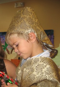 Mary got distracted when she noticed that the blanket around the plastic baby had come undone. Oblivious to anything else that was going on, she picked up the baby by one arm while she spread blanket out on the floor, laid the baby down, and wrapped the blanket perfectly around it. No baby was ever more lovingly swaddled than this one! Then she placed the baby on her shoulder as if he needed a good burping and rocked him while the rest of the children sang: